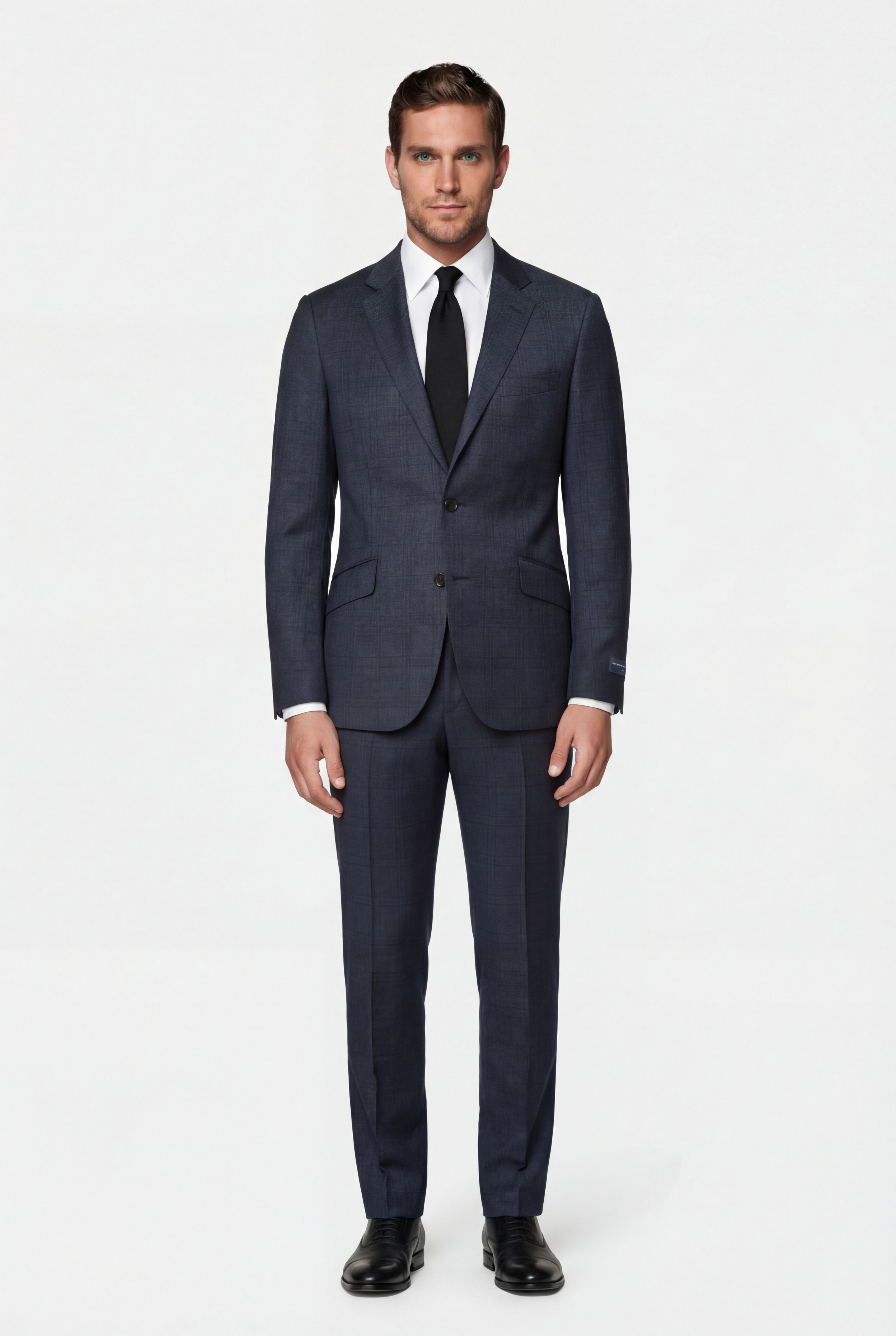 • Костюм приталенного силуэта из шерстяной итальянской ткани REDA super 130s. Пиджак однобортный, две шлицы. Застежка на две пуговицы. Воротник классический, отложной, на лацкане имеется фасонная петля. Край лацкана, воротник, клапаны декорированы отделочной строчкой «вспушка» (имитация ручного стежка). Два боковых кармана с клапанами, нагрудный карман «листочка». Рукава со шлицами, на четыре пуговицы пришитых внахлест расстегиваются (рабочая шлица) как у всех дорогих брендов. Четыре внутренних кармана, один застегивается на пуговицу. Брюки приталенного силуэта, два боковых кармана, два задних кармана с застежкой на пуговицу, на поясе предусмотрены шлевки для ремня.
