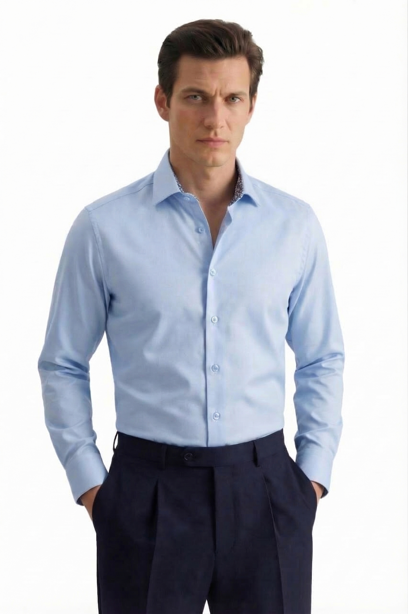 • Полуприлегающий силуэт, Классический воротник, Однотонный, Голубой