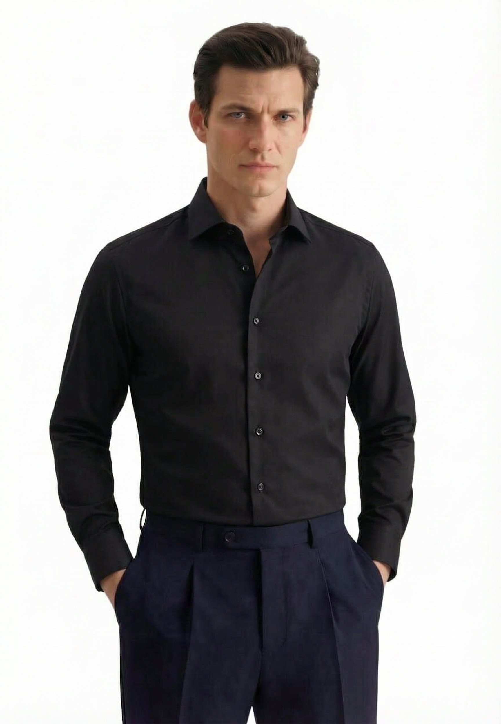 • Shaped Fit, Классический воротник, Однотонный, Черный