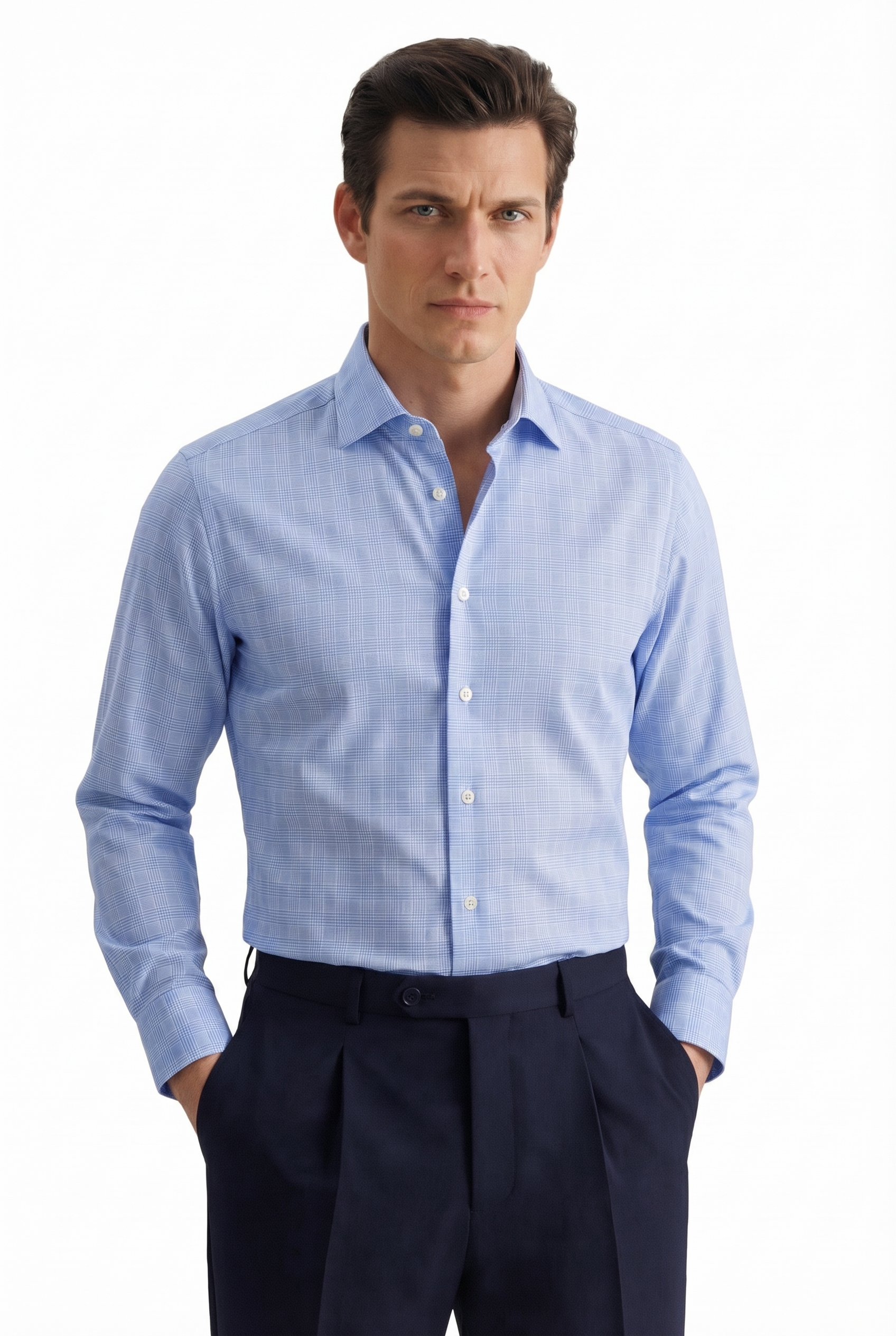 • Полуприлегающий силуэт, Классический воротник, Классический (на пуговице), Клетка, Голубой
