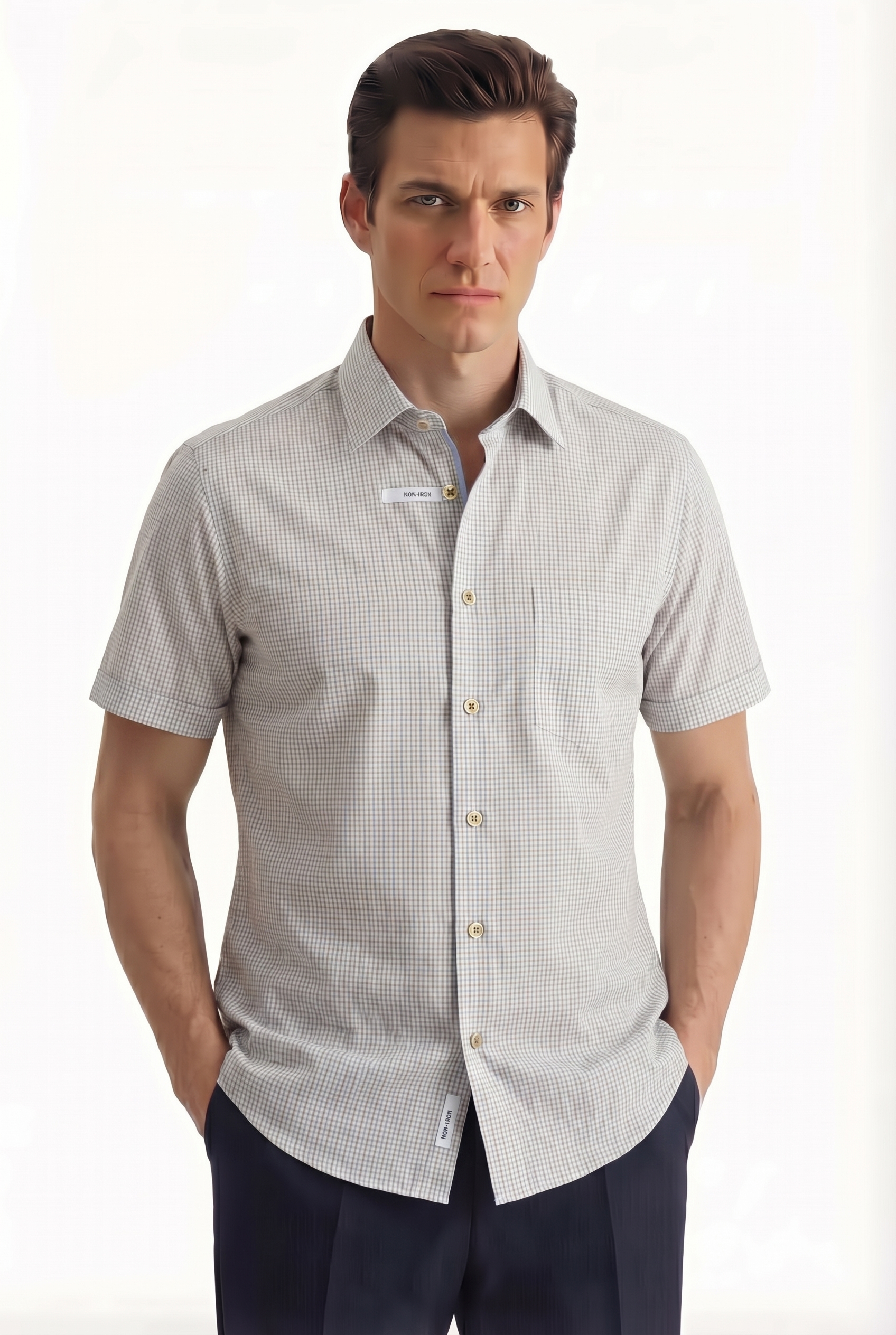 • Прямой силуэт, Классический воротник, Клетка, Коричневый
